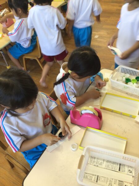 ペットボトルの蓋を使ってカスタネットを作りました。