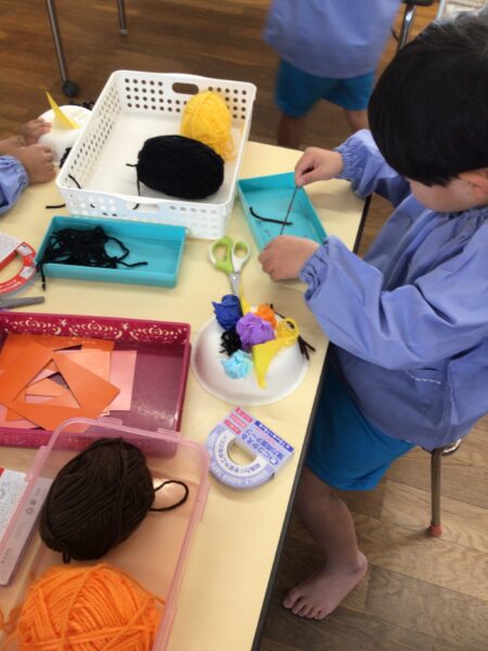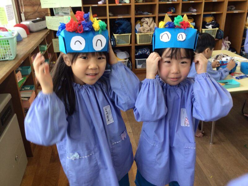 鬼のお面作りに精を出しています。飾り付けは自分好み!楽しそうな鬼のできあがり!