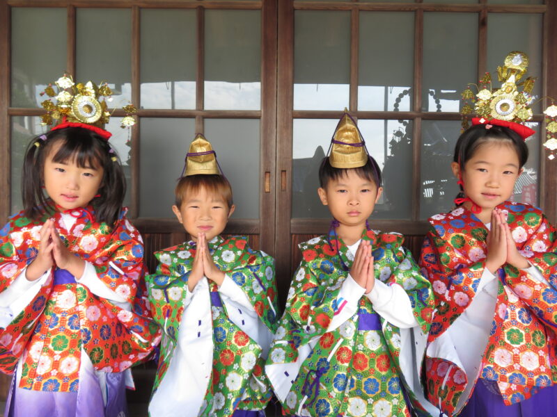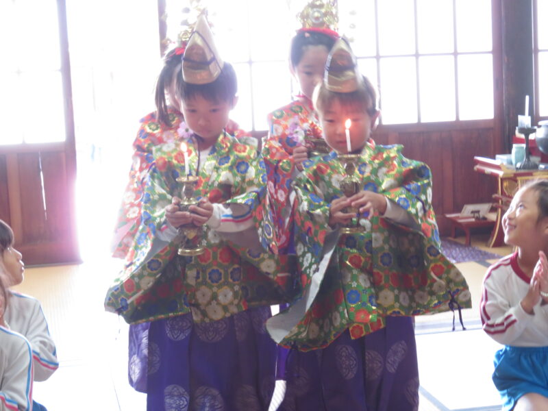 11月のお寺参りです。お稚児さんになるとロウソクのお灯とお花をお供えします。