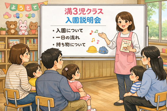 内容:3歳児入園説明会とほぼ同じですが、満3歳の注意事項があります。