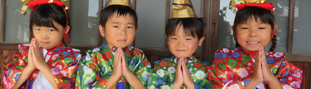 お寺へお参りにいきました。お稚児さんになってお花とお灯をお供えします。