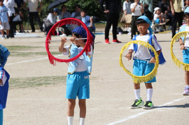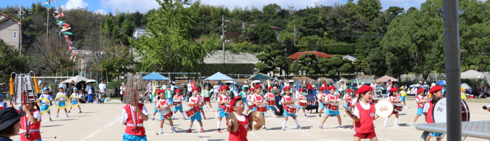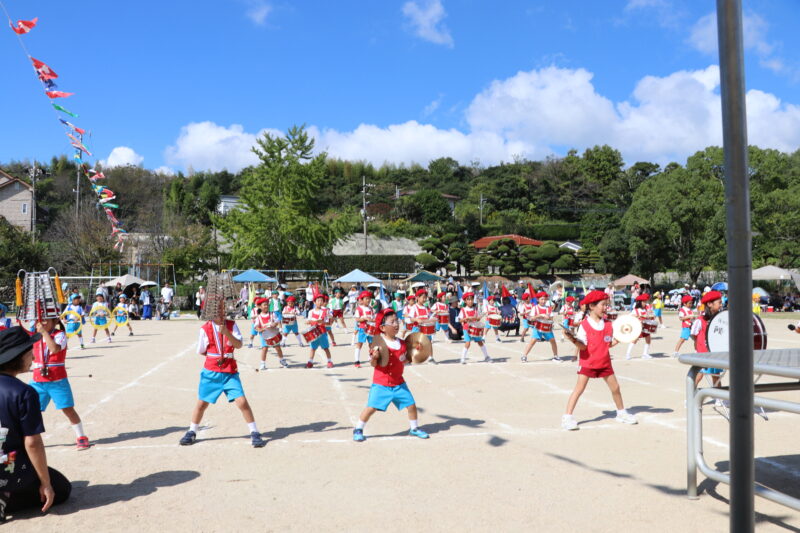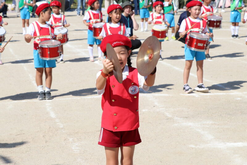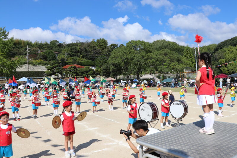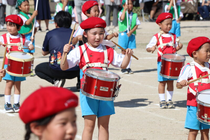 年長さんの鼓笛隊です。移動も上手にできました。広い場所での演技は気持ちがいい!