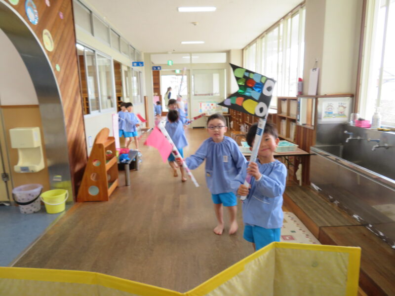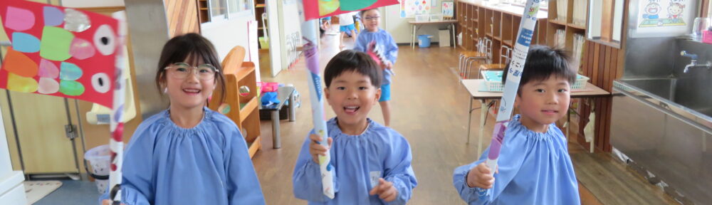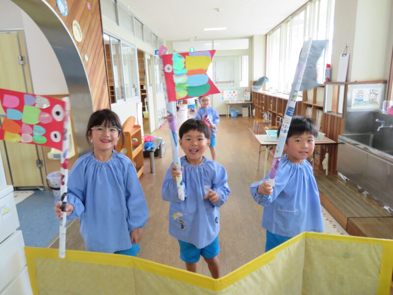 年長さんはオリジナルの鯉のぼりを制作しました。「園長先生!写真撮って!」と子どもたち。
